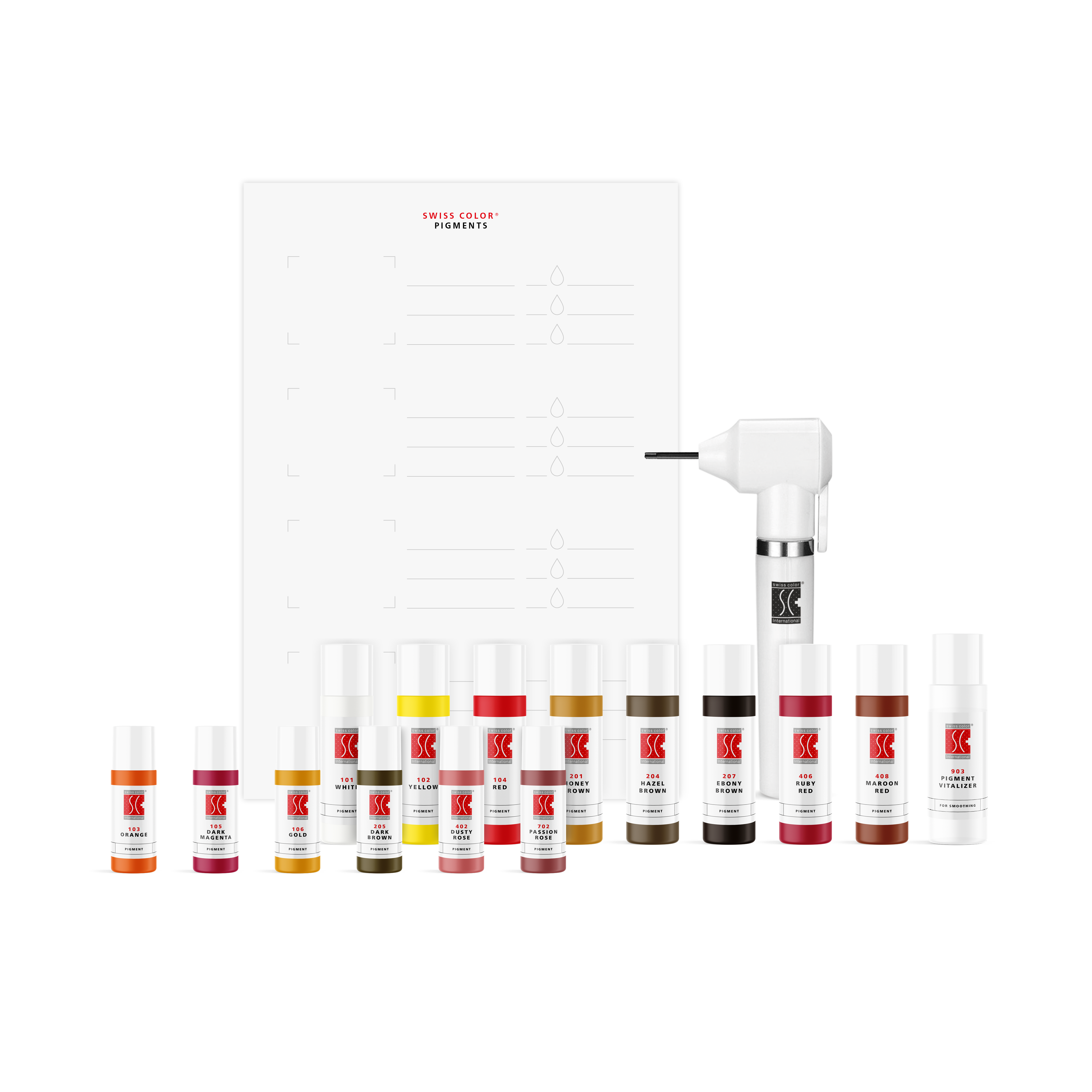 - 14 x Swiss Color Pigmente (101 White 10ml, 102 Yellow 10ml, 103 Orange 5ml, 104 Red 10ml, 106 Gold 5ml, 105 Dark Magenta 5ml, 201 Honey Brown 10ml, 204 Hazel Brown 10ml, 205 Dark Brown 5ml, 207 Ebony Brown, 402 Dusty Rose 5ml, 406 Ruby Red 10ml, 408 Maroon Red 10ml, 702 Passion Rose 5ml)
