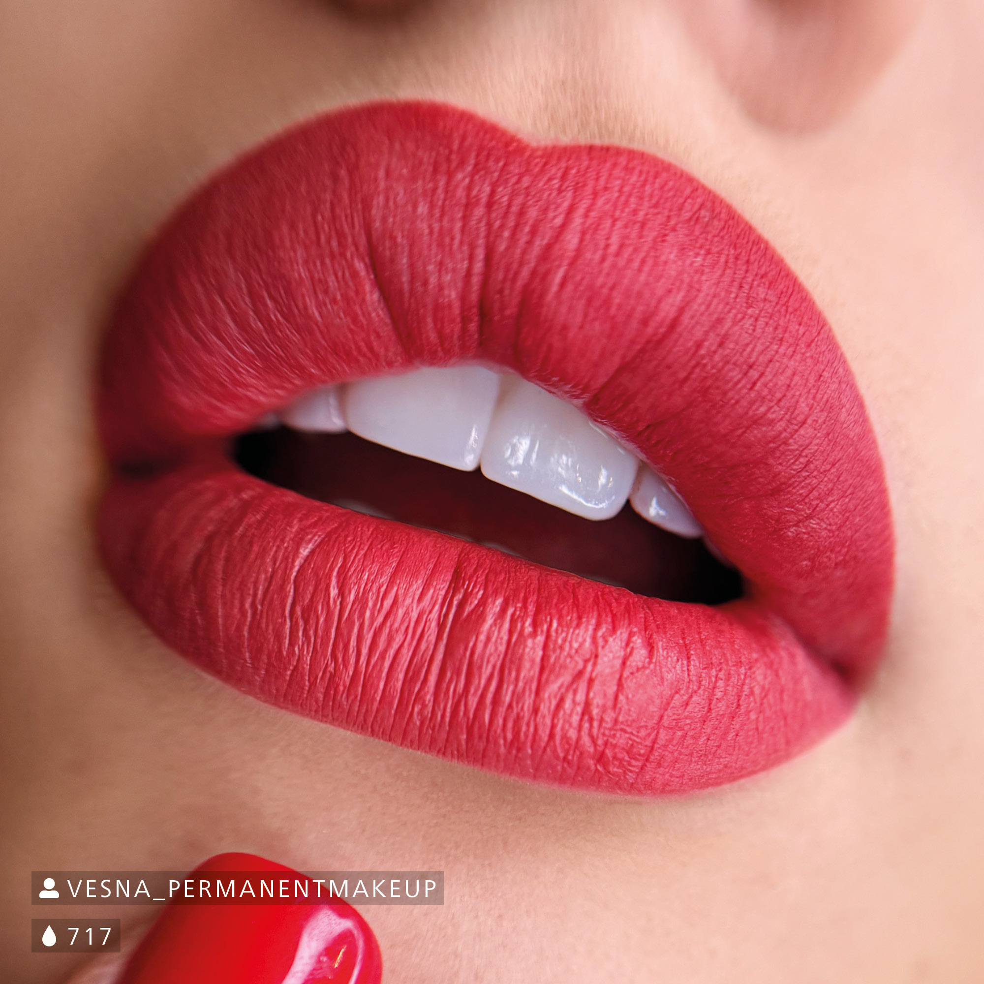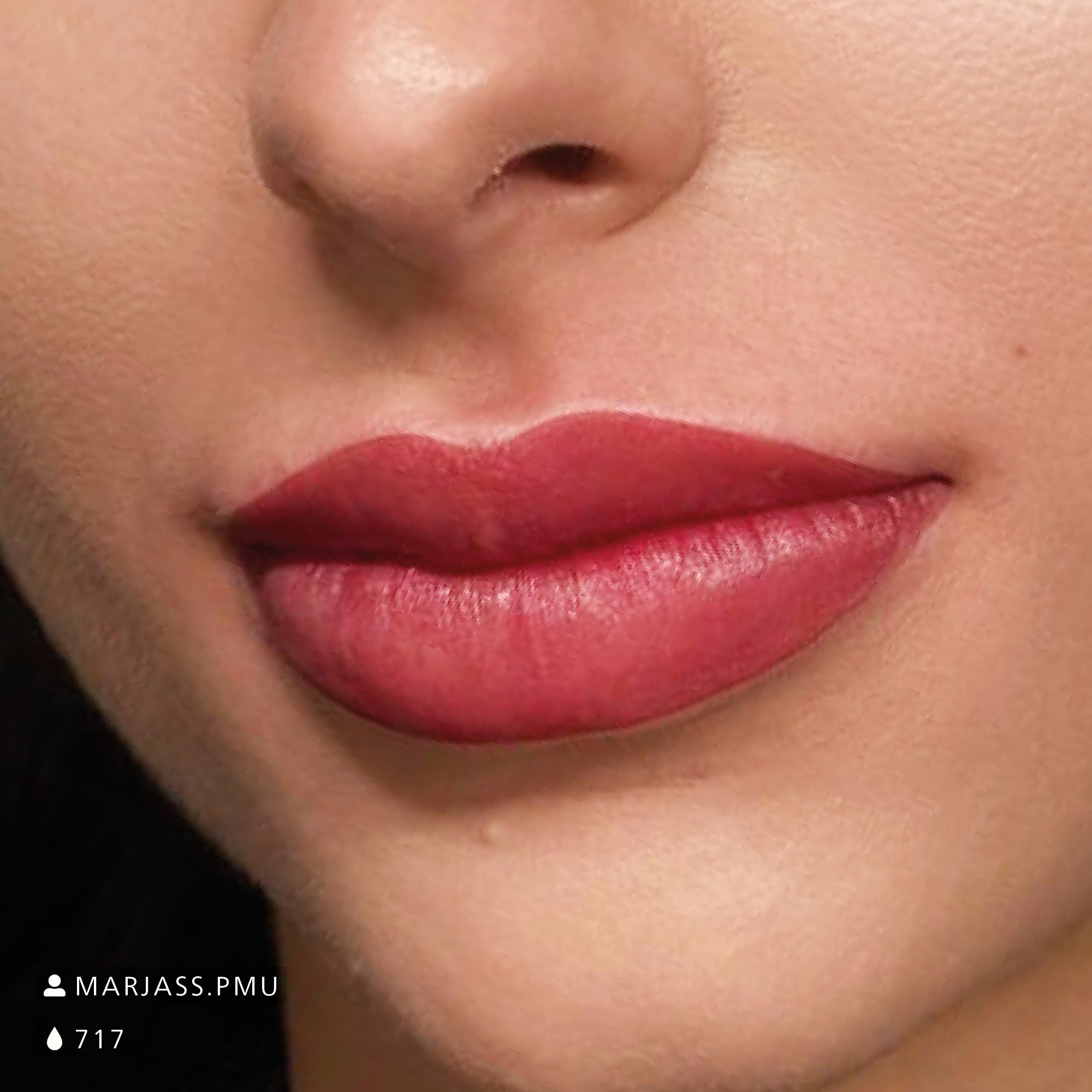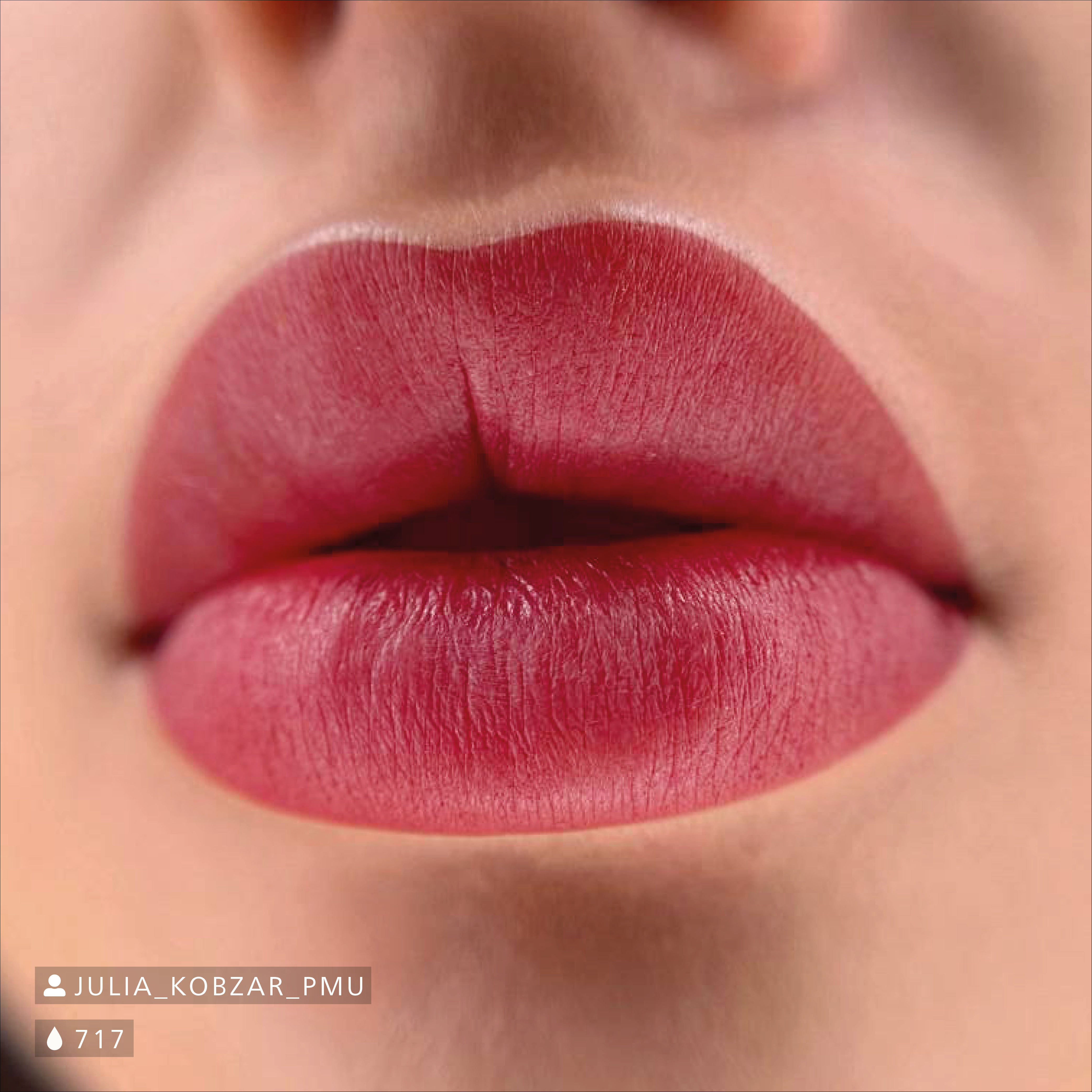 Diese Mischung vereint zwei beliebte Lippenfarben: 403 Passion Berry küsst 703 Arizona Red und kreiert diesen eleganten Rosenholzton. Der warme Unterton sorgt für einen frischen, rosigen Effekt, während ein Hauch Umbra die Farbe weich und natürlich wirken lässt. Ideal für Hauttypen I–IV, auch für Typ V geeignet. 717 Velvet Kiss pur ist eine Lieblingsfarbe unserer Profis für die Lippenpigmentierung und wird auch gerne als Mischfarbe für die Areolapigmentierung verwendet.